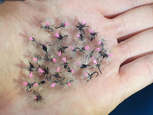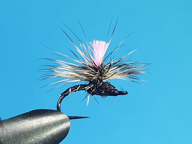 Manjši padalec tipa klinkhamer vezan z dobro vidnim ter ribi privlačnim grizzly peresom!