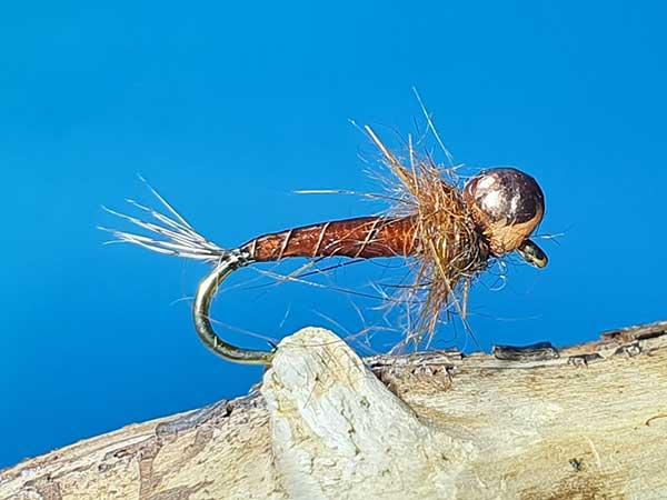 Majhna rjavkasta nimfa je namenjena lovu v globinah do 1,5m. Vezana na običajni trnek a z nesimetrično tungsten glavo, ki nimfo obrne na hrbet, kar je tipična lastnost jig-trnkov. Uv telesce ter minimalistično oprsje poskrbita, da nimfa relativno hitro tone.