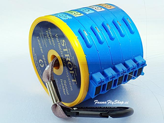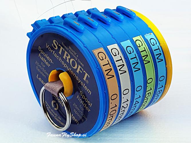 Edino prodajno mesto, ki vam najnovejši Stroft Dispenser tudi napolni! Napolnjen in pripravljen za uporabo! 5 različnih Stroft GTM najlonov! Novi model Stroft nosilca najlonov ima v primerjavi s prejšnjim dve pomembni novosti: Gumijasti vložek za rezilom preprečuje da bi ostanek najlona pobegnil nazaj v navitje. Druga prednost pa je, da lahko rezila poljubno obračate, kakor vam pač ustreza. Mi smo jih dali v ravno vrsto, drobni zobki na zgornjem in spodnjem robu pa omogočajo veliko drugačnih postavitev rezil. Set je opremljen tudi s sponko za pritrjevanje na telovnik ter vzmetnim obročem za montažo drobnih pripomočkov.