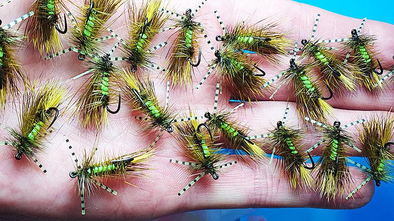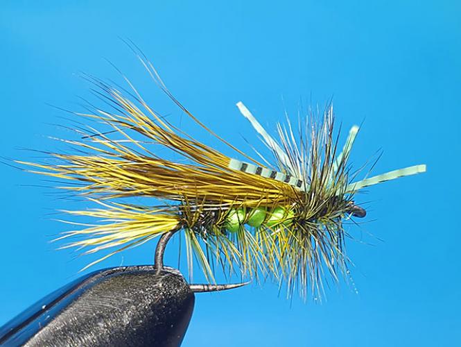 Velika suha muha vezana iz srnine dlake po vzorcu Irresistible. Dodane rumeno-črtaste gumijaste nožice za boljšo akcijo na vodni gladini. Odlična izbira za lov postrvi v poletnem času, ko so na pohodu kobilice!