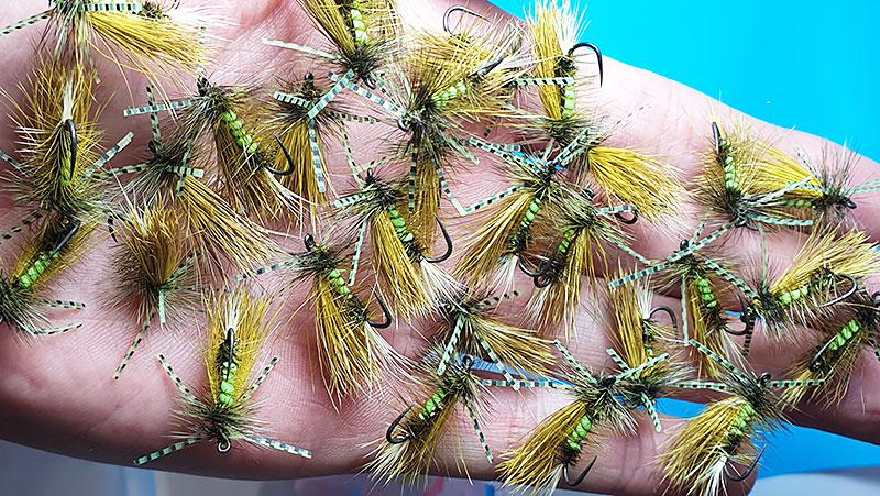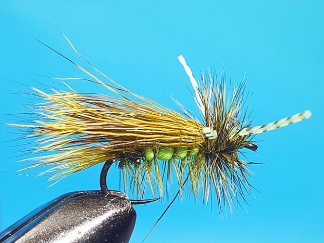 Velika suha muha vezana iz srnine dlake po vzorcu Irresistible. Dodane rumeno-črtaste gumijaste nožice za boljšo akcijo na vodni gladini. Odlična izbira za lov postrvi v poletnem času, ko so na pohodu kobilice!
