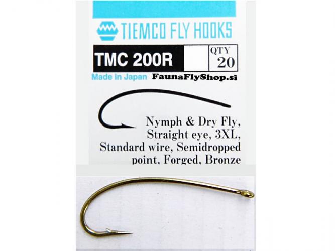 Trnek TMC200R ima krivino posneto po obliki žuželke! Povprečje najbolj pogosto imitiranih žuželk - bi se lahko reklo! Namenjen vezavi posnetkov kamenjark kobilic, če ga obrnete navzgor - celo majskih muh! POZOR! Zaradi ostre krivine boste nanj zelo težko namestili tungsten glavo. Mora biti dovolj velika in obvezno prevrtana v stilu reže (slotted). Močna žica, zdržal bo tudi večje ribe!